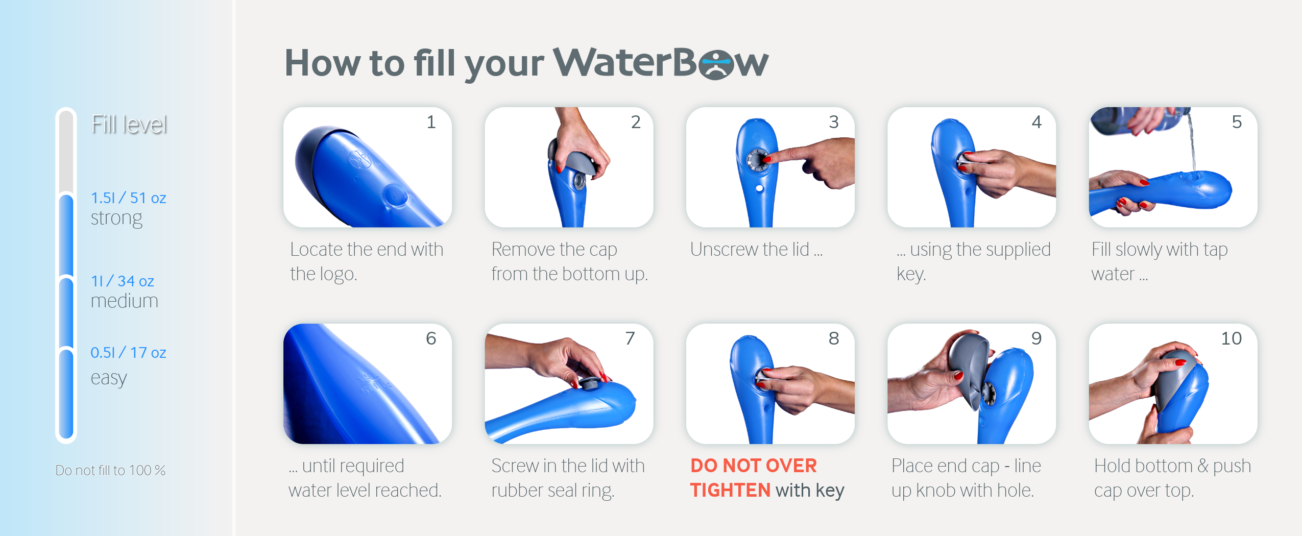 Your instruction manual includes a simple filling guide. Choose the amount that feels stable and comfortable: